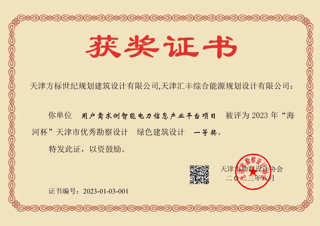 近日,由天津YABO鸭脖物联科技股份有限公司下属全资子公司:天津汇丰综合能源规划设计有限公司(以下简称“汇丰设计”)与天津方标世纪规划建筑设计有限公司联合申报的用户需求侧智能电力信息产业平台项目,荣获2023年“海河杯”天津市优秀勘察设计绿色建筑设计一等奖,在绿色建筑类别中,为唯一的一项一等奖(绿色建筑类别中,共4个获奖项目,其中一等奖1项,二等奖1项,三等奖2项)。