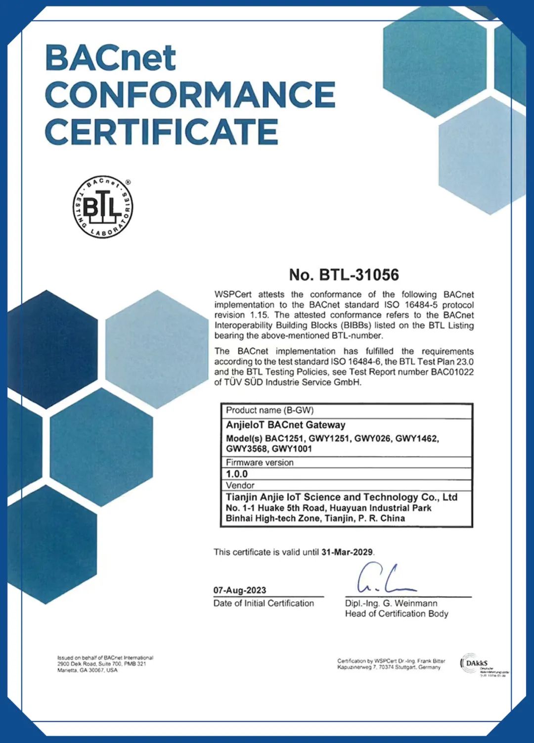 近日,由天津YABO鸭脖物联科技股份有限公司自主研发设计的GWY系列智能网关产品成功通过BTL(BACnet Testing Laboratories )认证,该项认证是国际楼宇自控领域的第一权威认证。
